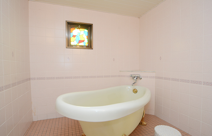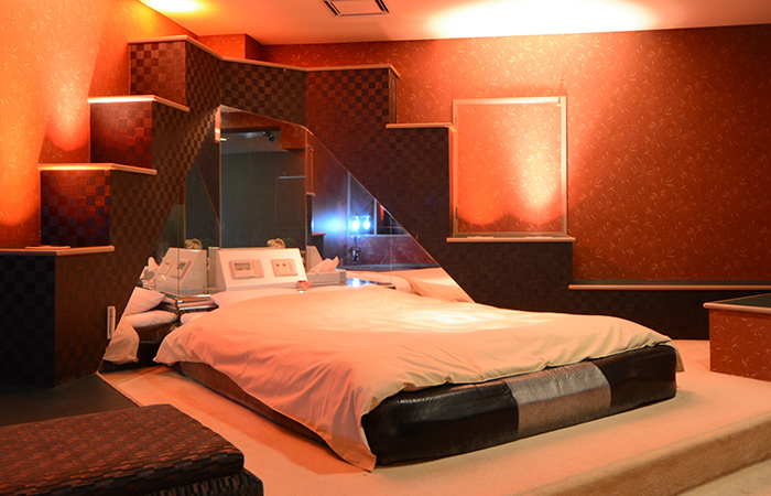 淡いピンクの壁紙と黒色、そしてステンドグラス調のライトのバランスが美しい少し広めのお部屋。