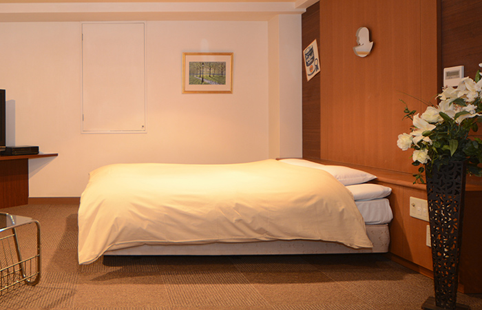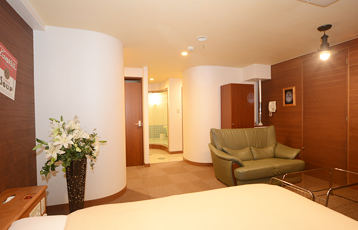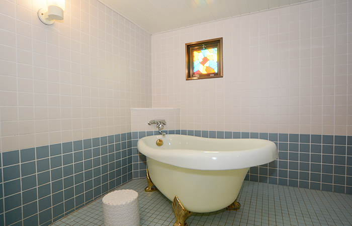 この部屋の特徴は何といっても、ドアを開けるとまず目に飛び込んでくる全面ガラス貼りのバスルーム。マットプレーが楽しめる。雰囲気はまさに70'sフレンチムービー。